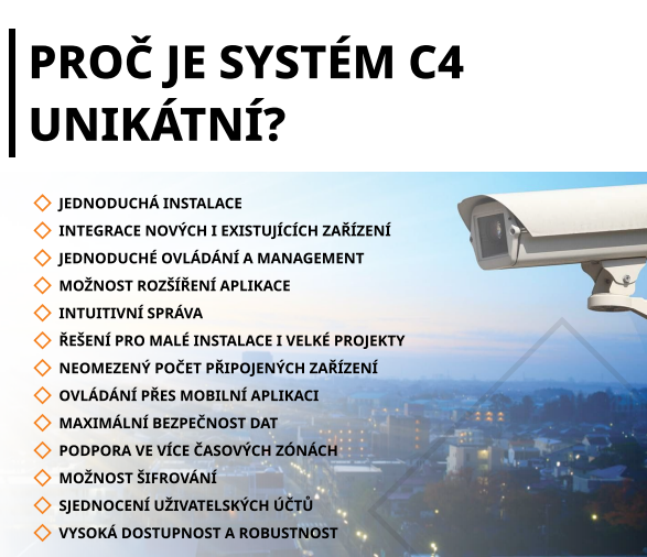 C4 je softwarové řešení pro komplexní řízení bezpečnosti budov. Revoluční systém, který integruje několik typů bezpečnostních technologií a propojuje zařízení různých světových výrobců do jednoho komplexního řešení.