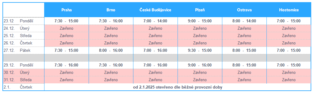 Pro ty z Vás, kteří by rádi využili našich služeb i mezi svátky, jsme k dispozici následovně: