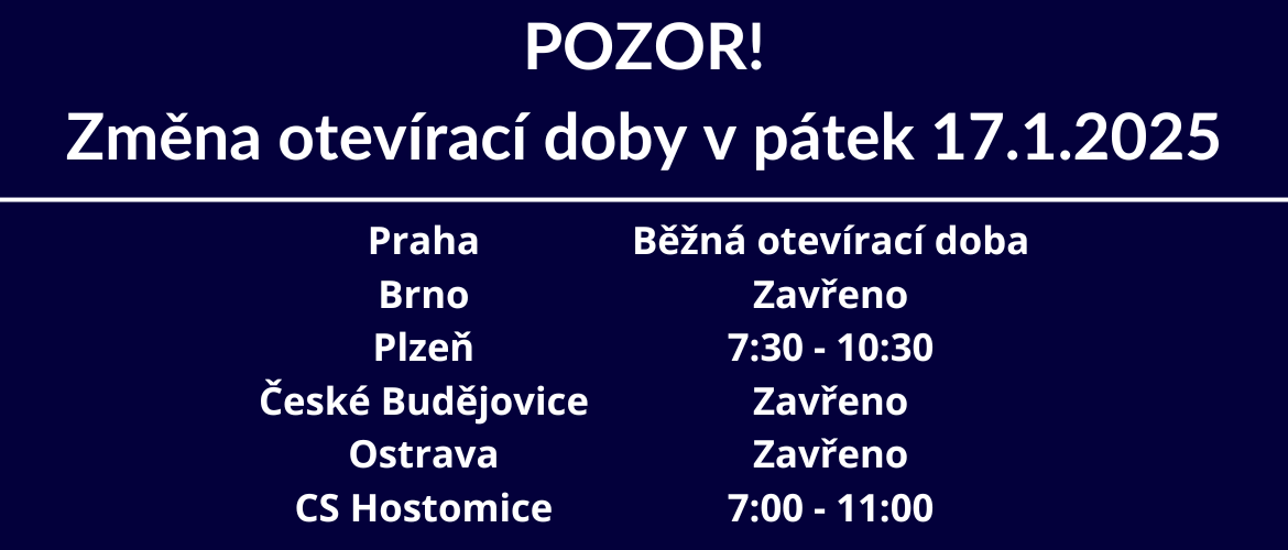 Vážení zákazníci v pátek 17.1.2025 bude na našich pobočkách výjimečně upravena otevírací doba.