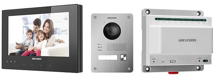 2-drátová sada videovrátníků / videotelefonů Hikvision DS-KIS701/EU-W pro 1 uživatele. Obsahuje, bílý bytový monitor DS-KH8340-TCE2 + dveřní stanici DS-KV8103-IME2 + napájecí distributor DS-KAD709 + zdroj na DIN 24VDC/2,5A