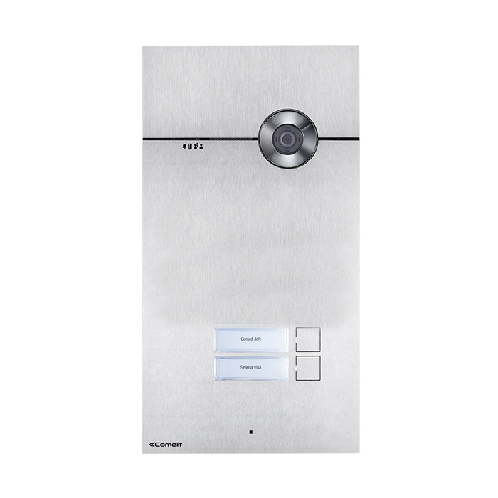 PRODEJ UKONČEN! 2 tlačítkový nerezový audio-video vstupní panel 3202XVS typu 316 ANALOG pro VIP systém Comelit s H.264 video kompresí. Jmenovky podsvícené LED diodami, dotyková tlačítka bez mechanických částí, odolnost IK08, indikace hovoru a otevření zámku dveří. Dodává se včetně zapuštěné instalační krabice a audio-video modulu 4682HC. Rozměry: 247x182x3 mm