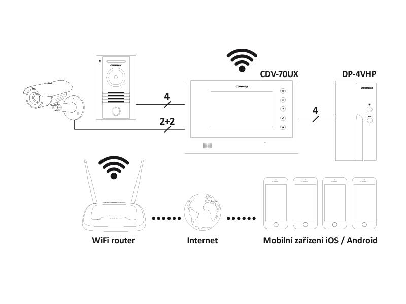 Videotelefon CDV-70UX stačí jen přihlásit na WiFi síť a do smartphonu stáhnout aplikaci COMMAX Smart Videophone, jenž je dostupná na App Store a na Google Play. V případě zazvonění na dveřní stanici začne zvonit i smartphone a po aktivaci hovoru lze hlasově komunikovat s návštěvníkem, na displeji se zobrazí obraz z dveřní stanice (popřípadě samostatné CCTV kamery) a z mobilu lze ovládat i dveřní zámek. Tuto komunikaci zajišťuje DDNS server výrobce. Díky spojení pomocí vyhrazeného DDNS serveru je možné tuto komunikaci Smartphonu se systémem videotelefonů využívat kdekoli, kde je přístup k mobilní datové síti, tedy i mimo domov.
