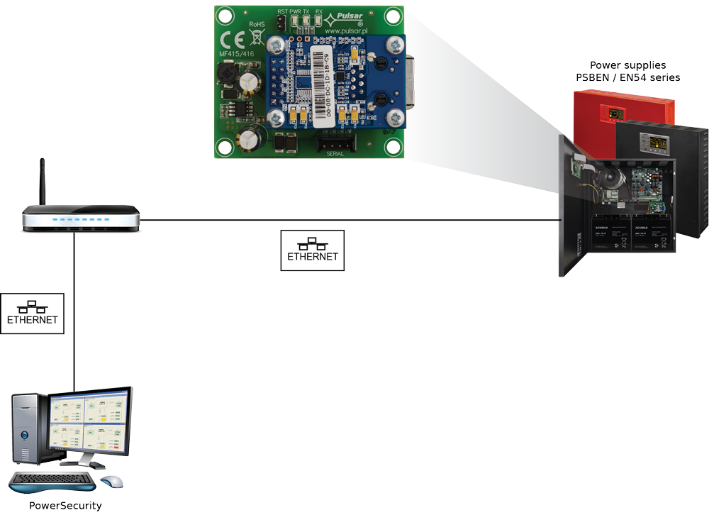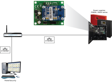 INTE - ETHERNET interface - Účel použití: Rozhraní ETHERNET je zařízení určené k připojení napájecích zdrojů řady PSBEN (Black Power) / EN54 (Red Power) k počítači v síti Ethernet. Systém PowerSecurity umožňuje vzdálené monitorování parametrů pomocí cyklického náhledu aktuálního stavu PSU, čtení historie událostí, náhledu proudových a napěťových grafů a dálkového testu baterie.