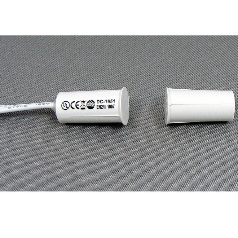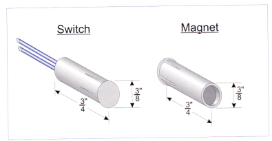 PRODEJ UKONČEN! Zápustný magnetický kontakt Aleph, pracovní vzdálenost 24 mm. Zápustný magnetický kontakt s tělem dlouhým 1,9 cm (3/4"), magnetická část má délku rovněž 1,9 cm. Obě části mají průměr necelý 1cm (3/8") s instalační vzdáleností 2,4 cm. Jedná se o odolný typ magnetického kontaktu se zapojení N.C.