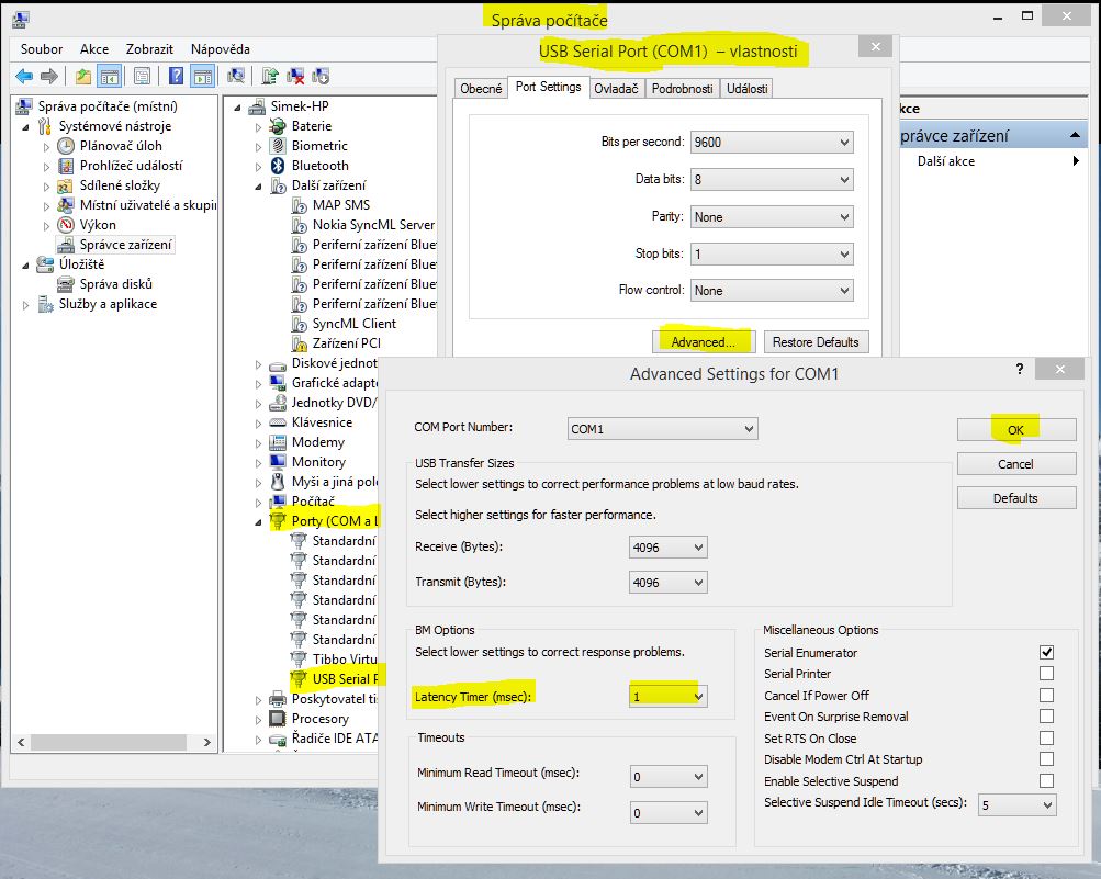 Pro komunikaci s ústřednami Risco je potřeba v rozšířených možnostech nastavení portu změnit defaultní hodnotu LatencyTimeru z 16 na 1.