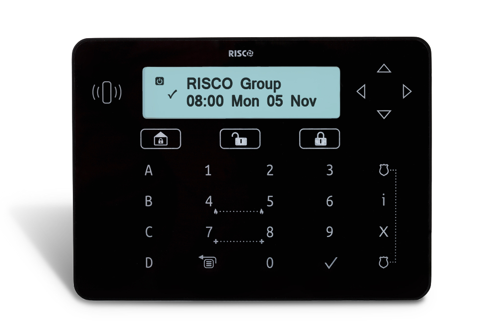 Elegantní černá LCD klávesnice RPKEL0B0000A s moderním dotykovým displejem Risco Group, kompatibilita s ústřednami ProSys, LightSys, ProSys plus a Lightsys Plus, jednoduchá montáž, odnímatelný zadní kryt. Rozměry: 177 x 129 x 24 mm.