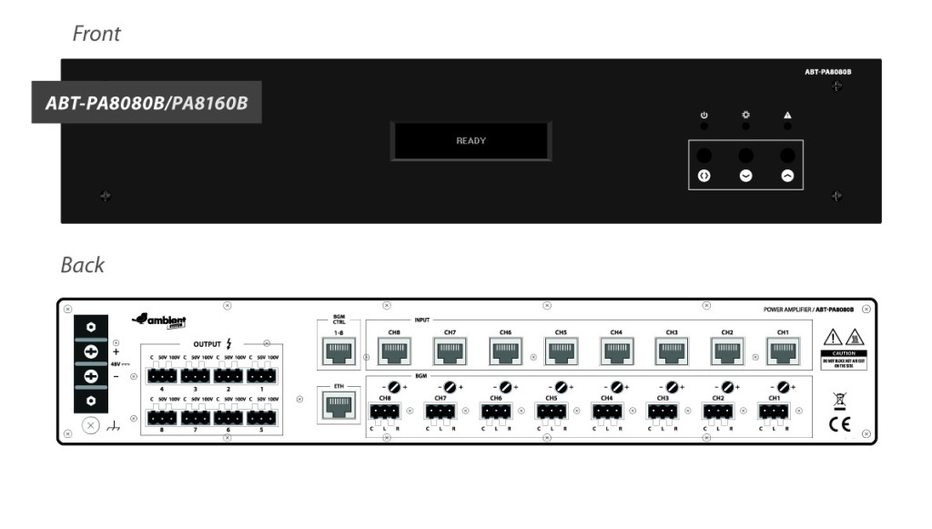 SMART-PA4160B - Výkonový zesilovač 4× 160 W třídy D. Lze použít můstkové zapojení: 1× 320 W + 2× 160 W; 2× 320 W. Vstupy pro externí BGM.