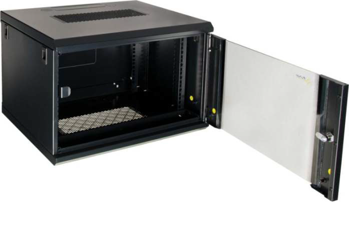 PRODEJ UKONČEN! VÝROBA UKONČENA Úložná výška : 6U Standard : 19" Způsob použití : nástěnný Barva : černá - RAL 9004 Nosnost : 60kg Rozměry : 368x560x450mm Dveře : přední = prosklené se zámkem - 5mm tvrzené sklo (2 klíče v balení) Balení : nesmontováno