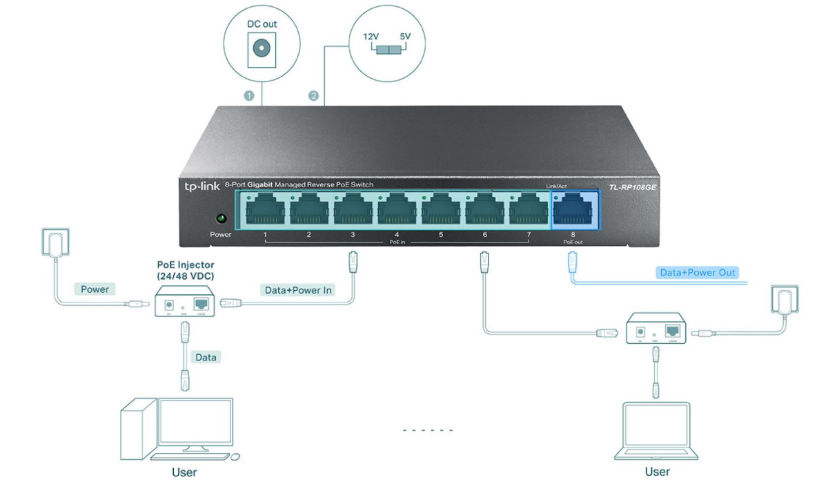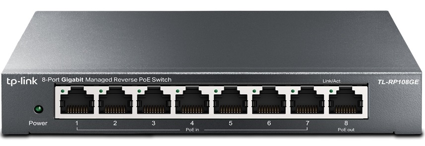 8 portový řízený desktop/PoE switch TP-link TL-RP108GE se 7 PoE vstupy a 1 PoE výstupem. Rychlost 10/100/1000 Mbps na všech portech RJ-45, v plně duplexním modu až 2000Mbps. IP zařízení lze napájet do 100 metrů od switche přes UTP Cat5E (1000Base-T).Maximální výkon do 32,74 W. Dále zařízení obsahuje DC port s přepínatelným napětím 5V/12V k napájení jiných zařízení, např. ONT. Rozměry jsou 158 × 99.1 × 25 mm.Napájení přes PoE. Provozní teplota od 0°C do 40°C.