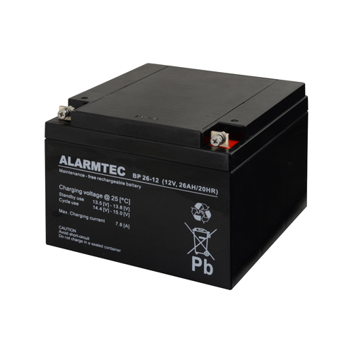 PRODEJ UKONČEN, Akumulátor 12V/26Ah, Šroub M5 Baterie vyrobená technologií AGM (Absorbed Glass Mat) je typ olověného akumulátoru, ve kterém je elektrolyt nasáknut do netkané textilie ze skelného vlákna. To vám dává výhody jako velmi nízké samovybíjení (1–3% za měsíc) a schopnost dodat vysoké proudy. Proto je tento akumulátor vhodný pro zálohu napajéní EZS a CCTV.