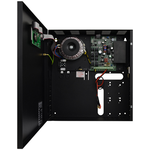 LCD panelem. Zdroj nabízí prostor pro akumulátor o velikosti 17Ah/12V. Skříň je určena pro povrchovou montáž se zajištěním pomocí šroubů.
