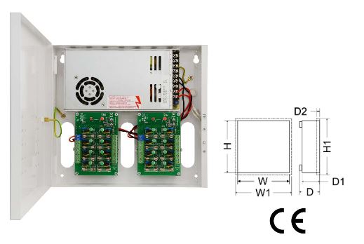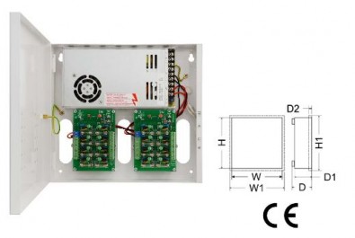 PRODEJ UKONČEN, Napájecí zdroj PSDC161220 pro 16 HD kamer PTC/TOPIC, vstupní napětí 88÷264VAC/50Hz, výstupní napětí 16x 1,2A/12VDC, rozsah regulace napětí 12V÷15V, účinnost 87%, ochrana SCP, OLP, OVP*, tamper (otevření skříně), FPS - signalizace funkce výstupní pojistky (typ OC), rozměry 280 x 256 x 50+8 mm, povrchová montáž Stabilizovaný spínaný zdroj určený k napájení zařízení 12V/16x1,2A. Vhodné pro zajištění napájení kamerových systémů. Vyznačuje se vysokou odolností proti poškození způsobenému zkratem z výstupního obvodu. Obsahuje výstup AW informující o poruše pojistky na výstupu.