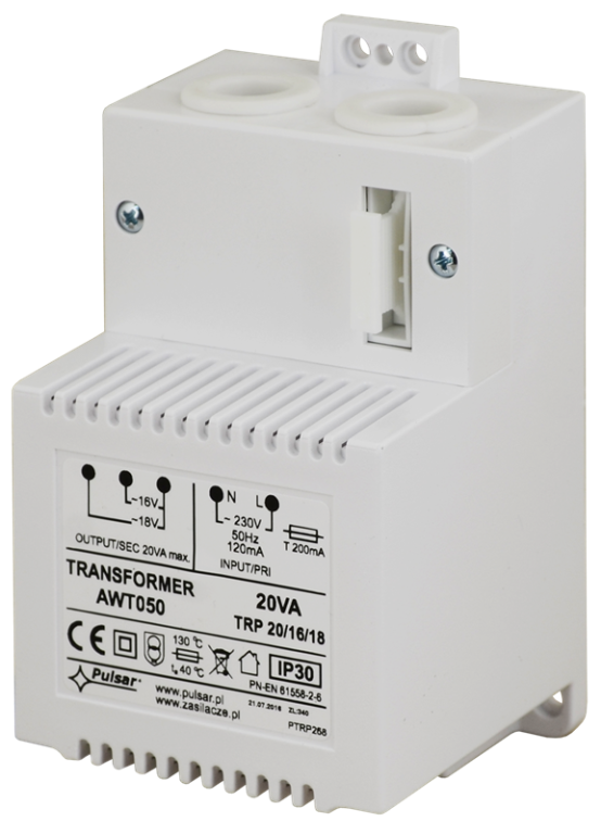 PRODEJ UKONČEN! Výkon transformátoru AWT050 je 20VA, vstupní napětí 230V/50Hz/0.12A. Hodnota výstupního napětí je 16V/1.2A nebo 18V/1A. Trafo má tepelnou pojistku s odolností 130°C. Skříně jsou PC/ABS V-O, IP30. Pro montáž na DIN lištu potřebujete držák AW0466.