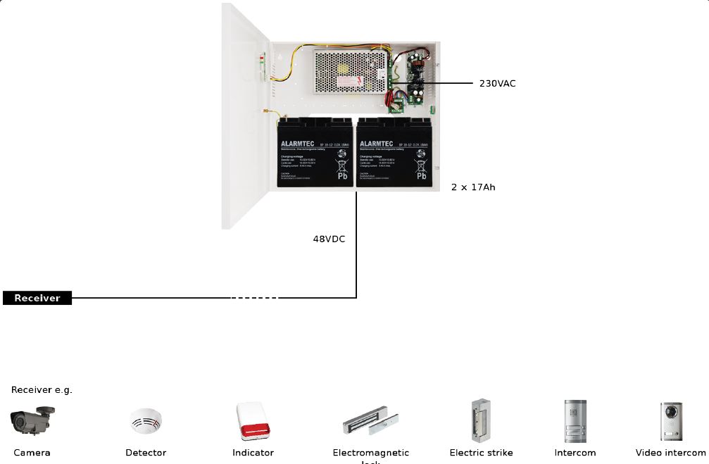 Záložní impulzní napájecí zdroj 48V/2,5A, v kovovém boxu s prostorem pro aku 2x17Ah, Rozměry 400x350x92