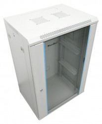 19“ složený rozvaděč, jednodílný na stěnu, výška 18U, šířka 600mm, hloubka 450mm. Šedá barva. Skleněné dveře, kouřové sklo. Nosnost 60kg.