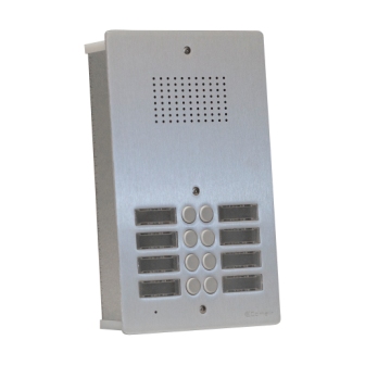 Audio zapustný vstupní panel z eloxovaného 4mm hliníku s 44 tlačítky pro audio modul IKALL. Zápustná krabice z pozinkovaného ocelového plechu včetně objímek na žárovky (žárovky nejsou součástí).