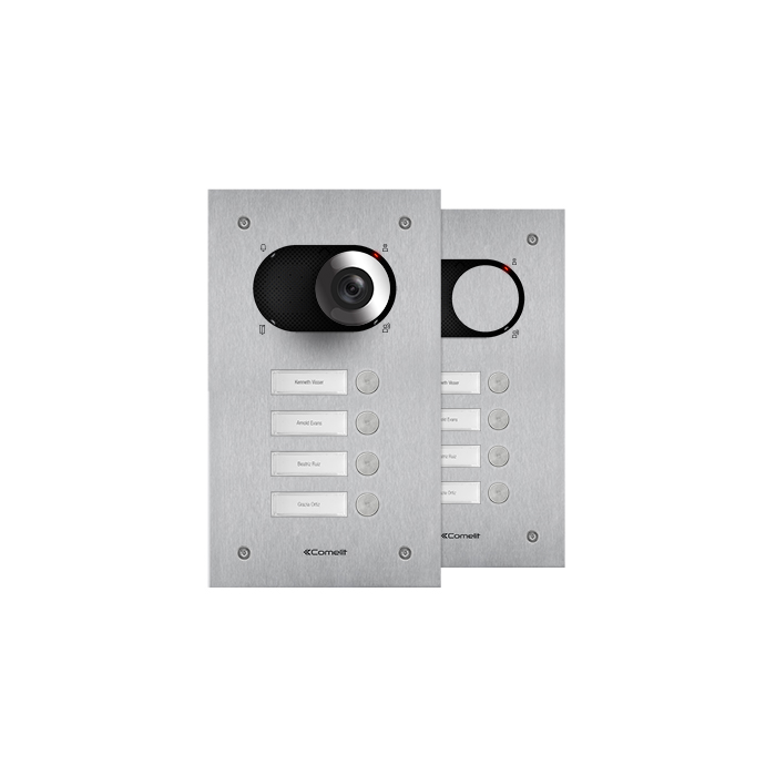 4 tlačítkový 2,5mm nerezový panel Switch včetně adaptéru pro umístění audio nebo video hovorové jednotky IKALL (Simplebus/VIP). Tlačítka s bílým podsvícením kompletně namontována a zapojena. Výměna jmenovek z přední části bez nutnosti demontáže celého panelu. Odolnost IK08, nutno zkompletovat s instalační krabicí (povrchová/zapuštěná IX9150) Rozměry: 150x262,7x2,5 mm