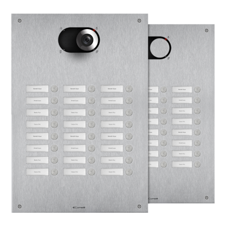 24 tlačítkový (3x8 tlačítek) 2,5mm nerezový panel Switch včetně adaptéru pro umístění audio nebo video hovorové jednotky IKALL (Simplebus/VIP). Tlačítka s bílým podsvícením kompletně namontována a zapojena. Výměna jmenovek z přední části bez nutnosti demontáže celého panelu. Odolnost IK08, nutno zkompletovat s instalační krabicí (povrchováIX9165/zapuštěná IX9155) Rozměry: 302,9 x 448,9 x 2,5 mm.