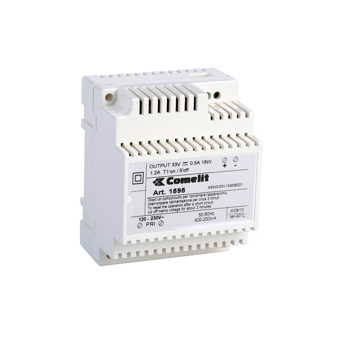 Napájecí zdroj 33VDC pro tabla Comelit s IKALL nebo ULTRA hovorovými jednotkami. Trvalý odběr 500mA, krátkodobý až 1,2A, ochrana proti přetížení a zkratu, rozměry: 71,7x90x62 mm (4 DIN moduly)
