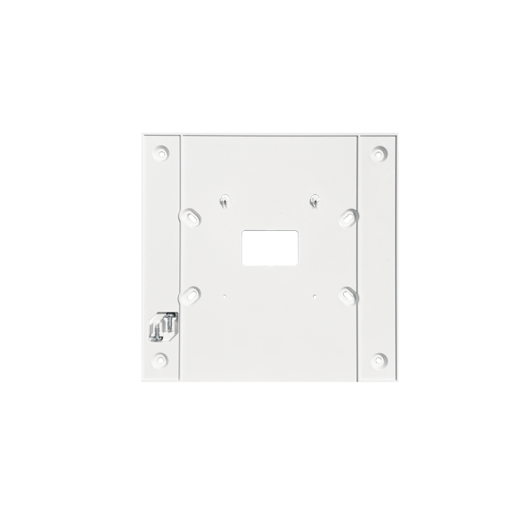 Bílá plastová podložka AC6719 pro monitor People se sluchátkem umožňující přívod kabelů lištou bokem a nebo instalaci na zapuštěnou krabici 6117. Rozměry: 177x172x10 mm