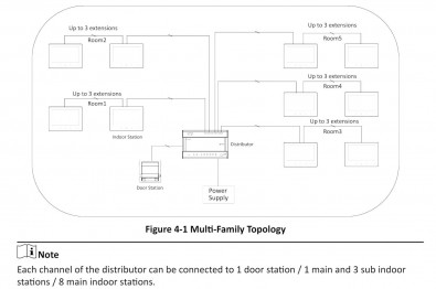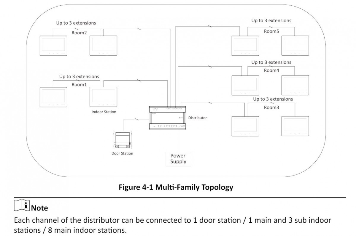 Distributor DS-KAD7060EY Hikvision pro dvoudrátové audio-video interkomy. 8x dvoudrátové rozhraní pro kaskádování distributorů, kanál 1-6 pro napájení dveřních nebo vnitřních stanic. Optická signalizace pro každý vstup.