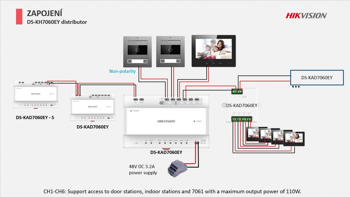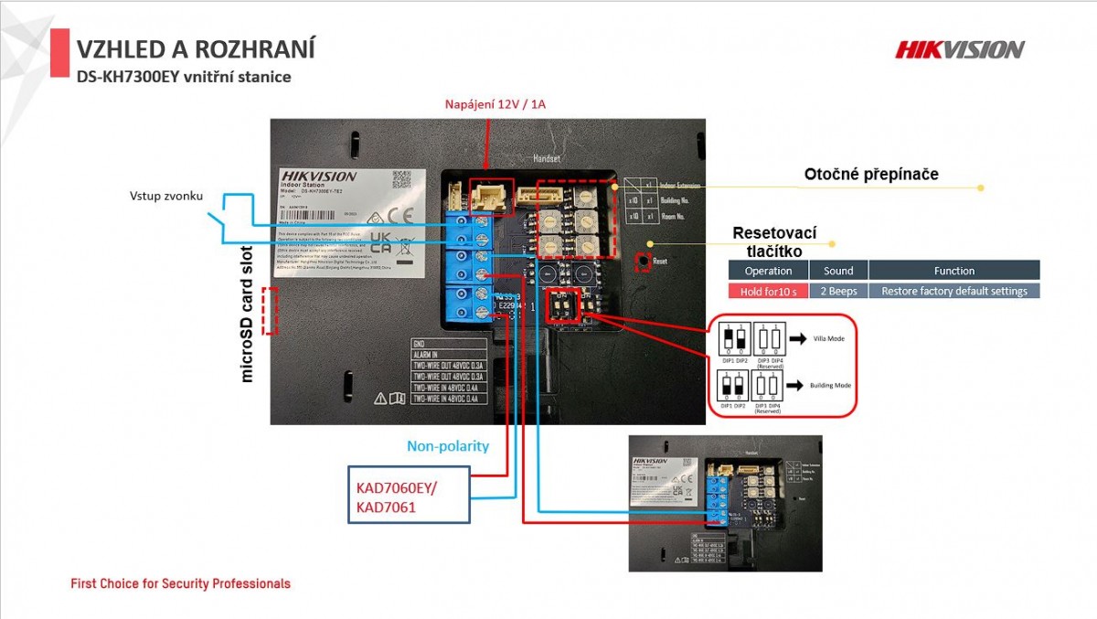 Dvoudrátový vnitřní video-interkom Hikvision DS-KH7300EY-TE2/White s dotykovým 7" LCD displejem s rozlišením 1024x600, nechybí ani 3 fyzická tlačítka k jednoduchému ovládání. Zařízení běží na operačním systému Linux s pamětí 128MB a je vybaveno vestavěným mikrofonem a reproduktorem. Audio komprese G.711U, 64Kbps, Zlepšení kvality zvuku díky omezení šumu a ozvěny. Dále zařízení disponuje alarmovým vstupem a slotem na SD kartu do 128 Gb, Síťová komunikace pomocí 10/100 Mbps přes 2-drátové rozhraní. Napájení 48V pomocí jednotky DS-KAD7060EY nebo KAD7061EY. Provozní teplota od -10°C až +50°C. Rozměry 190.2 × 138.2 × 20 mm. Povrchová instalace.