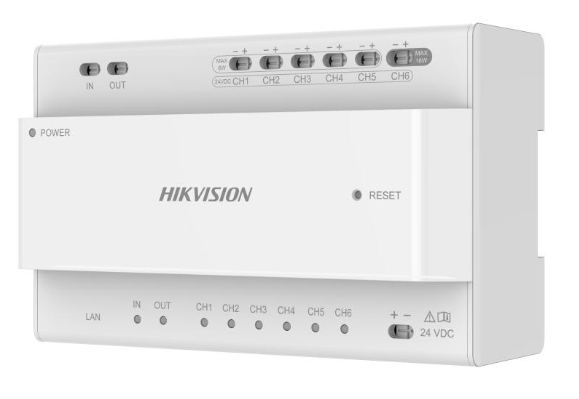 Distributor DS-KAD706Y Hikvision pro dvoudrátové audio-video interkomy. 2 vstupy pro připojení dalších distributorů a 6 vstupů pro monitory. Optická signalizace pro každý vstup.1x RJ45 pro připojení LAN.