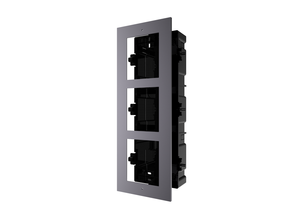 Zápustný 3 modulový hliníkový rámeček Hikvision DS-KD-ACF2 k modulárním interkomům včetně plastové instalační krabice. Rozměry rámečku: 337,8x124×33 mm, box 332x109x56 mm
