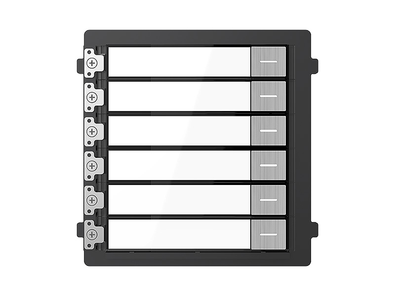 6-ti tlačítkový nerezový modul DS-KD-KK/S pro modulární IP i 2-drátové video intercomy Hikvision. Připojení do hlavní jednotky pomocí rozhraní RS-485. Podsvícená tlačítka se jmenovkami, určené pro povrchovou, tak i zápustnou montáž. Modul je napájený z hlavní jednotky.