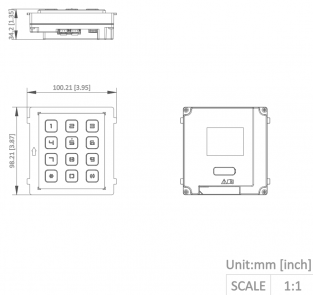 Stříbrná kódová klávesnice Hikvision DS-KD-KP/S pro modulární IP i 2-drátové video intercomy Hikvision. Připojení do hlavní jednotky pomocí rozhraní RS-485. Podsvícená tlačítka, klávesnice ovládá relé na hlavní jednotce a umožňuje též volání zvolené adresy. Krytí IP65, odolnost IK7. Rozměry: 98,5x100x34,2 mm, pracovní teplota -40 až 55°C.
