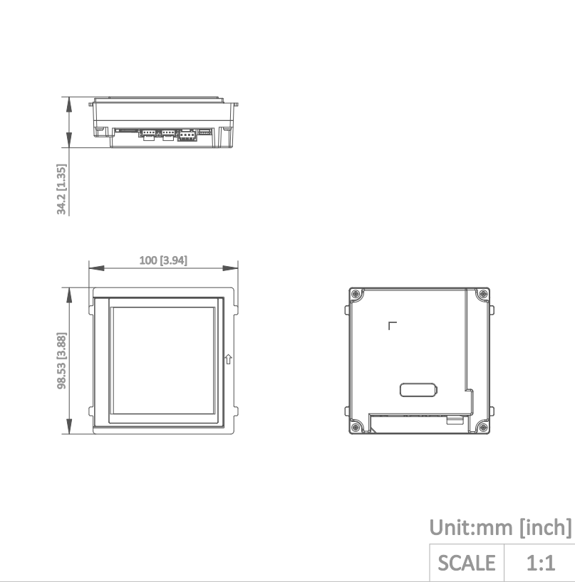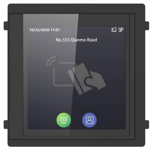 Dveřní modul Hikvision DS-KD-TDM s dotykovým 4" IPS displejem s rozlišením 480x480, čtečkou Mifare karet a kódovou klávesnicí pro volbu účastníků / otevření zámku. Operační systém - Linux, ROM 32 MB, 128 MB. Modul zobrazuje vytáčená čísla, seznam kontaktů a umožňuje odemykání PIN kódem nebo kartou. Nechybí zabudovaný bzučák.