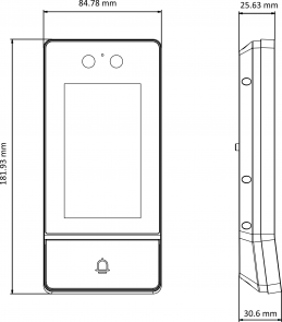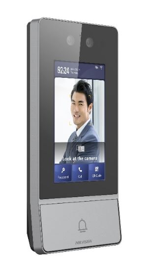 IP dveřní terminál Hikvision DS-KV9503-WBE1 s dotykovým 4,3" LDC displejem, funkcí interkomu a otevření dveří pomocí obličeje/karty/PINU/QR kódu.