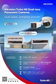 3K ColorVu PanoVu turret kamera Hikvision DS-2CE72KF3TP-DLS s duálním fixním objektivem a ohniskovou vzdáleností 2.8mm zachycující 180° obraz. Kamera je vybavena snímačem s ultravysokou citlivostí, který zajišťuje kvalitní obraz i při zhoršených světelných podmínkách. Kamera disponuje vysokou fyzickou kompenzací protisvětla včetně mnoha dalších podpůrných funkcí pro zlepšení kvality obrazu včetně bílého LED i IR přísvitu s dosahem až do 40 metrů.