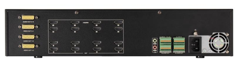 BNC, dále alarmovými i audio vstupy, výstupy. Síťové připojení je zajištěno pomocí 2 portů RJ45 do rychlosti až 1Gbps. Napájení je 220V AC, rozměry 440 x 321 x 88 mm, pracovní teplota -10°C do 55°C. Možné rozdělení obrazovek: 1/2/4/6/8/9/12/16/25.