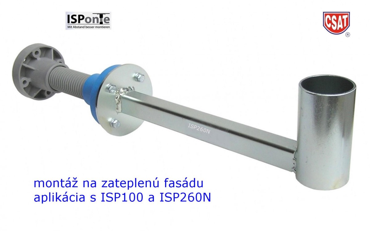 Univerzální konzole ISP100 pro profesionální uchycení držáků kamer do zateplených fasád bez tepelných mostů. Průměr trubky 70mm, do hloubky izolace 100-130mm. Maximální zatížení 1,22kN. Hmotnost 0,158kg.