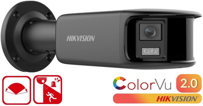 8MPx IP ColorVu venkovní Bullet Panoramic kamera Hikvision DS-2CD2T87G2P-LSU/SL(C) s 2x monofokálním objektivem a ohniskovou vzdáleností 4mm. Kamera je vybavena 2x snímačem CMOS 1/1.8 a disponuje ultravysokou citlivostí 0,0005lux a maximálním rozlišením 5120 x 1440 při 12.5fps. Moderní video komprese - H.265+/H.265/H.264+/H.264. Kamera disponuje 130dB WDR a podporuje řadu funkcí - 3D DNR, BLC, HLC. Přísvit bílým světlem dosahuje vzdálenosti až do 40m.Tento model je vybavený slotem na SD kartu až do kapacity 512GB dále je tato kamera vybavena Alarm a Audio vstupy, výstupy včetně vestaveného mikrofonu, reproduktoru a stroboskopického světla. Síťové připojení je zajištěno pomocí portu RJ45 až do rychlosti 100Mbps, nechybí ani podpora protokolu ONVIF a případný mobilní monitoring je umožněn přes aplikaci Hik-Connect. Ochranu zařízení zajišťuje krytí IP67. Napájení kamery je pomocí 12V DC/PoE. Provozní teplota -30°C až do +60°C.