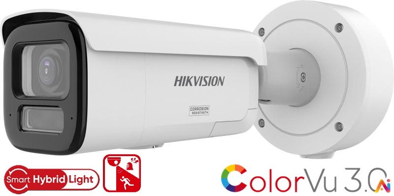 8MPx IP ColorVu AI hybridní venkovní bullet kamera Hikvision DS-2CD2687G3-LIZS2UY/SL s varifokálním objektivem a ohniskovou vzdáleností 2.8 - 12mm. Kamera je vybavena snímačem s ultravysokou citlivostí, který zajišťuje kvalitní obraz i při zhoršených světelných podmínkách. Kamera disponuje vysokou fyzickou kompenzací protisvětla včetně mnoha dalších podpůrných funkcí pro zlepšení kvality obrazu včetně bílého LED i IR přísvitu s dosahem až do 60 metrů.