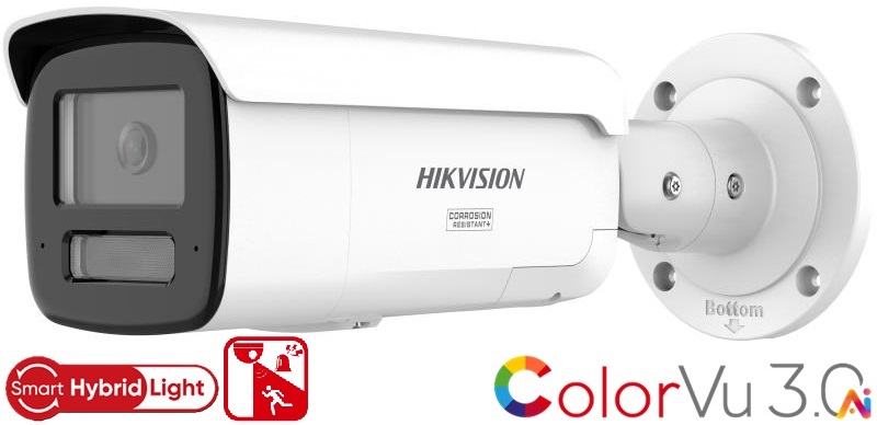 6MPx IP ColorVu AI hybridní venkovní Bullet kamera Hikvision DS-2CD2T67G3-LIS2UY/SL s fixním objektivem a ohniskovou vzdáleností 2.8mm. Kamera je vybavena snímačem s ultravysokou citlivostí, který zajišťuje kvalitní obraz i při zhoršených světelných podmínkách. Kamera disponuje vysokou fyzickou kompenzací protisvětla včetně mnoha dalších podpůrných funkcí pro zlepšení kvality obrazu včetně bílého LED i IR přísvitu s dosahem až do 60 metrů.
