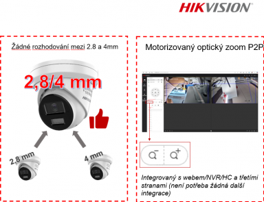 Point-varifokální (Poin-to-Point) objektiv- tento objektiv umožňuje přepínání mezi 2.8 a 4mm. Přepínání je možné přes PTZ ovládání NVR/kamery přes lokální monitor, mobílní aplikaci, webové rozhraní a IVMS4200.