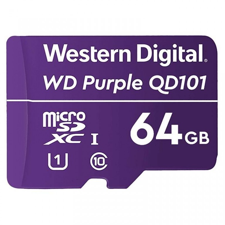 Paměťová karta Western Digital WD Purple microSDXC 64GB UHS-I U1 (WDD064G1P0C) s kapacitou 64GB. Karta spadá do rychlostní třídy Class 10 s rychlostí čtení 100Mb/s a rychlostí zápisu 60Mb/s. Formát paměťové karty je MicroSDXC. Karta je konstruována na provoz 24/7.