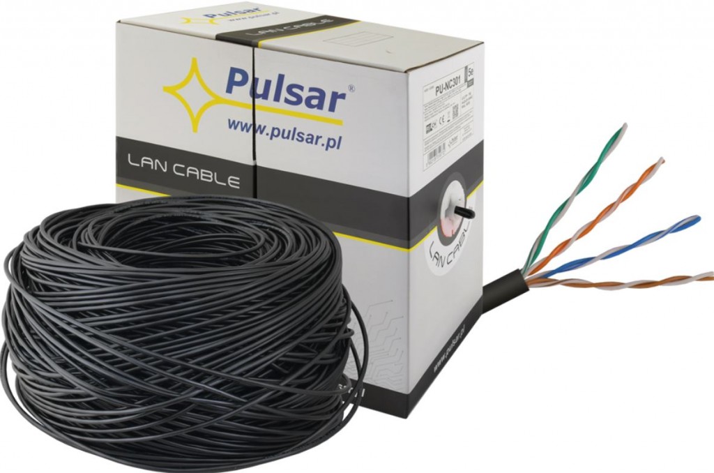 Venkovní, nestíněný instalační kabel pro strukturované kabeláže PU-NC301 od výrobce Pulsar kategorie 5E v provedení drát. Konstrukce kabelu je UTP, typ pláště PE s třídou reakce na oheň Fca, Každý vodič rozdělen jinou barvou vnější plášť barvy černé. Vodičem je měděný drát 0,50mm AWG 24, průměr celého kabelu činní 5,3mm. Pracovní teplotní rozsah: -20°C až 50°C. Kabel je dodáván v kartonové krabici po 305 metrech.