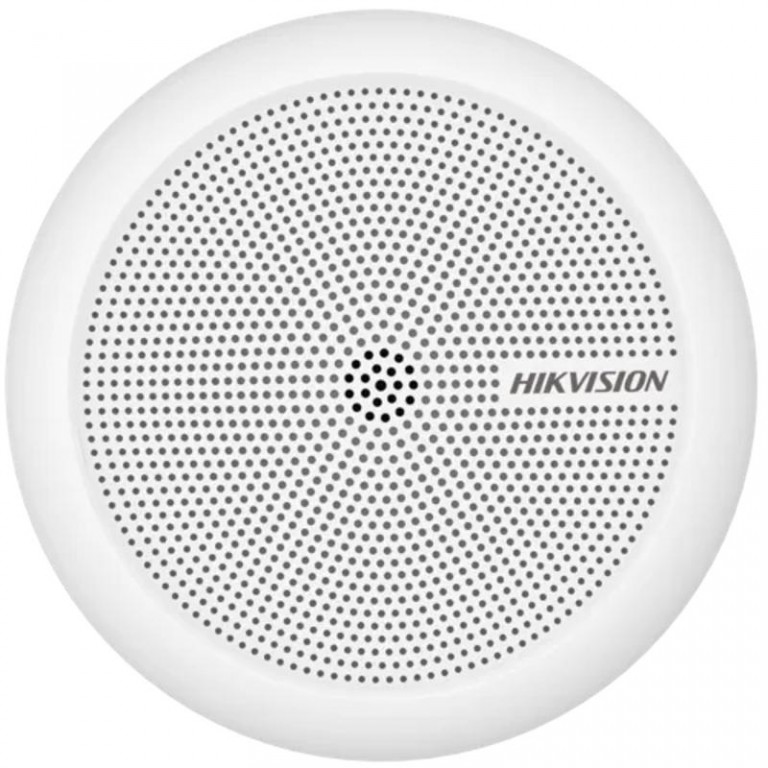 Vnitřní bezpečnostní mikrofon Hikvision DS-2FP2061 k montáži na strop nebo na zeď, s aktivním dosahem 5 metrů v poli 360°, frekvenční odezva 20 Hz až 20 kHz, dynamický rozsah 0 - 90 dB. Napájení 12 VDC. Rozměry Ø 85 × 20.48 mm.