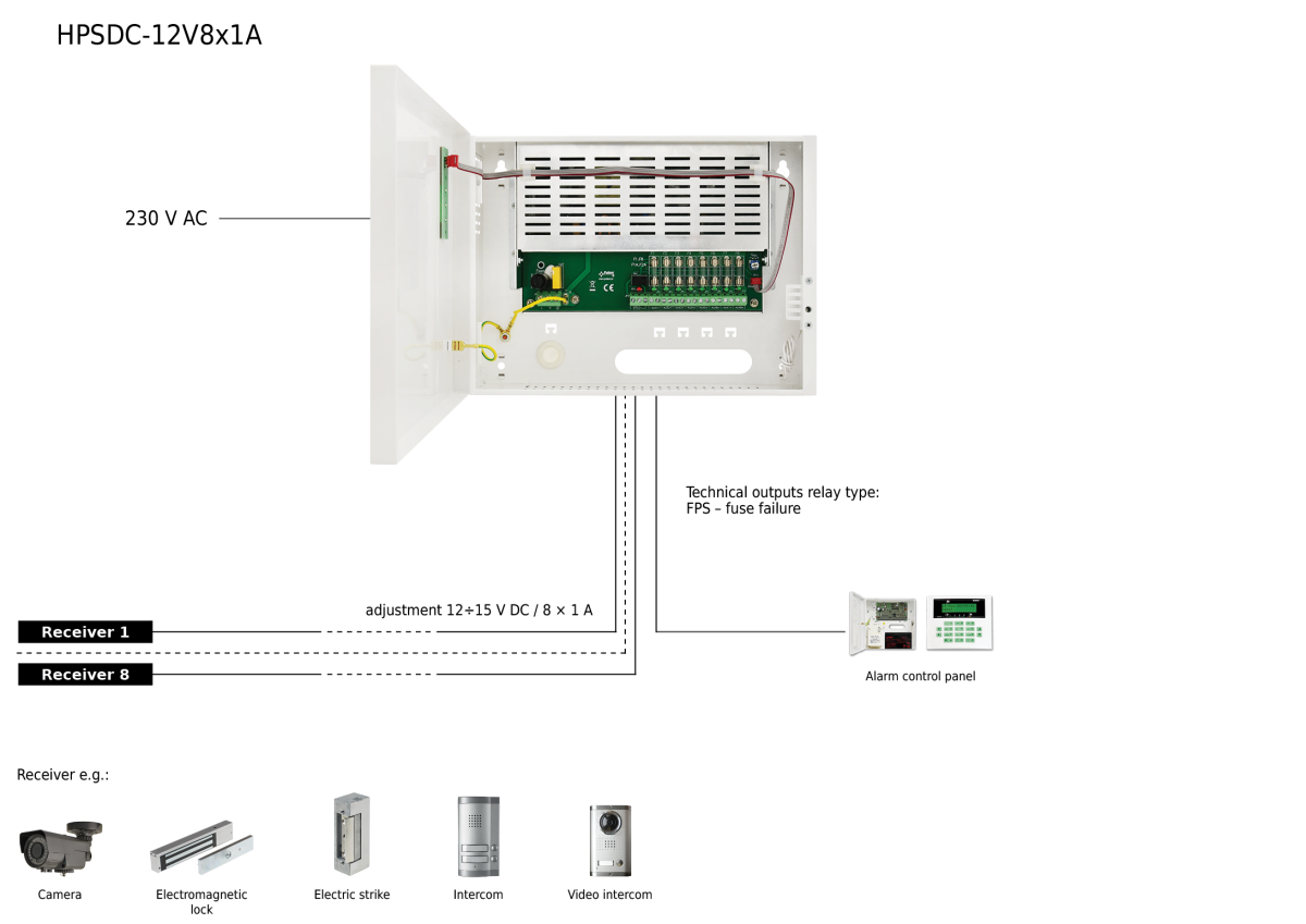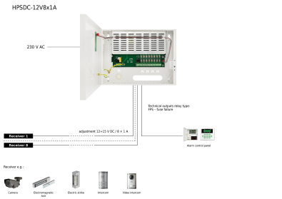 Nezálohovaný napájecí zdroj 12VDC/8x1A HPSDC-12V8X1A v ocelovém boxu. Vstupní napětí 200-230V AC, výstupní 12-15V DC, max zatížení 8x1A/ 12V DC (ochrana tavnou pojistkou 1A). Učinnost až 86%. Monitoring
