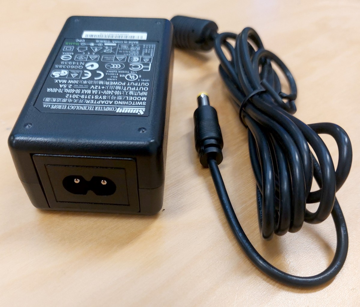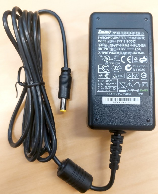 Napájecí spínaný zdroj Sunny SYS1319-3012. Vstupní parametry: 100-240 V AC ~ 1 A, 50-60 Hz, 70-80 VA. Výstupní parametry: 2,5 A/12 V DC. Maximální výstupní výkon je 30 W.