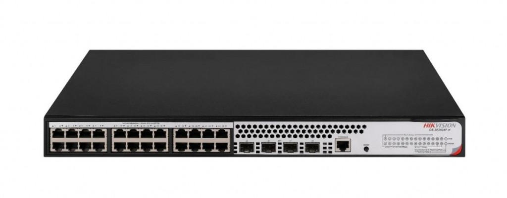 29 portový řízený PoE switch Hikvision DS-3E2528P-H s možností napájet až 24 IP zařízení současně do maximálního výkonu 370W s výkonem na jeden port maximálně 30W, v případě zapojení všech portů 15,41W. IP zařízení lze napájet až při rychlosti 10Mbps pro UTP Cat5E. Switch podporuje i PoE+. Síťové připojení je zajištěno pomocí portu RJ45 (1Gbps) pro metalické rozvody, při využití optických rozvodů s SFP moduly rovněž 1Gbps. Napájení je 230V AC. Rozměry jsou 440 x 44 x 260mm. Provozní teplota -5°C až do +45°C.