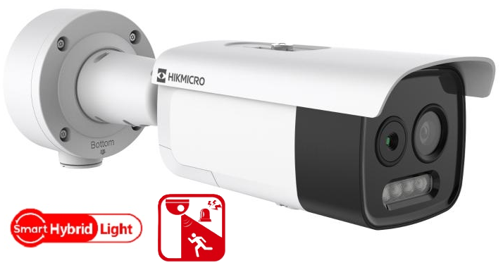 Termální bi-spektrální IP venkovní bullet kamera Hikmicro HM-TD2628-10/G1/T3A s monofokálními objektivy a ohniskovými vzdálenostmi 9,7 mm pro termální objektiv a 12,4 mm pro běžný objektiv.