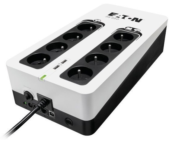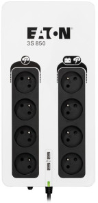 Záložní zdroj 3S850F od výrobce Eaton zajišťuje pokročilou ochranu vašich domácích i kancelářských spotřebičů v případě výskytu nežádoucích jevů a událostí, jako jsou bouřky, přepětí v síti či poruchy a živelné události. Při úplném výpadku poskytuje UPS záložní napájení z baterie až čtzřem z osmi připojitelných zařízení. Baterie se trvale dobíjí a UPS lze nastartovat i bez napájení z elektrorozvodné sítě (studený start). UPS lze díky USB rozhraní snadno zpravovat z počítače. Kompaktní a atraktivní design dokonale zapadne do každého moderního obytného nebo kancelářského prostředí. Model dále disponuje systémem pro montáž na stěnu.