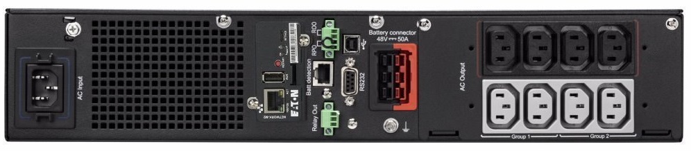 - Komunikační porty: 1x USB typ B, 1x sériový port RS-232, 1x svorkovnice pro dálkové zapínání/vypínání, 1x svorkovnice pro dálkové odstavení, 1x svorkovnice pro výstupní relé, 1x RJ-45, 1x USB-A, 1x microUSB