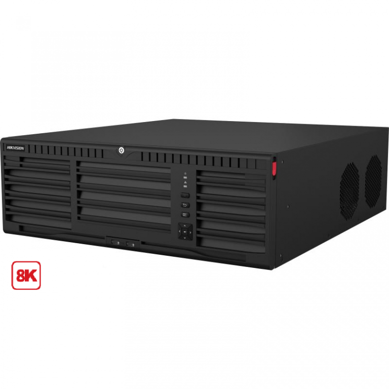 Síťový videorekordér Hikvision DS-96128NI-M16 pro připojení až 128 IP kamer s maximálním rozlišením 32MPx a až 8 IP reproduktorů. Vstupní datová propustnost je 400Mb/s, výstupní 400Mb/s. Rekordér umožňuje připojení 16x HDD SATA o velikosti až 16TB. Podpora video komprese je zajištěna pomocí video kodeků H.265+/H.265/H.264+/H.264. Síťové připojení přes 2x RJ-45 10/100/1000 Mbps zajišťuje dostatečnou rychlost pro datový tok ze záznamového zařízení do sítě. Video výstup je umožněn konektory 2x VGA, 1x CVBS, 1x HDMI při rozlišení 8K a 1x HDMI při rozlišení 4K, nechybí ani 2x USB - 2.0, 2x USB 3.0, dále alarmové a audio vstupy, výstupy pro připojení dalších technologií. Napájení videorekordéru je 100-240V AC. Velikost rekordéru je 3U a rozměry jsou 445 x 496 x 150 mm. Provozní teplota -10°C až do +55°C.