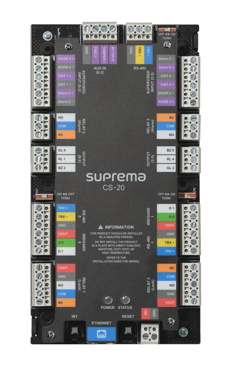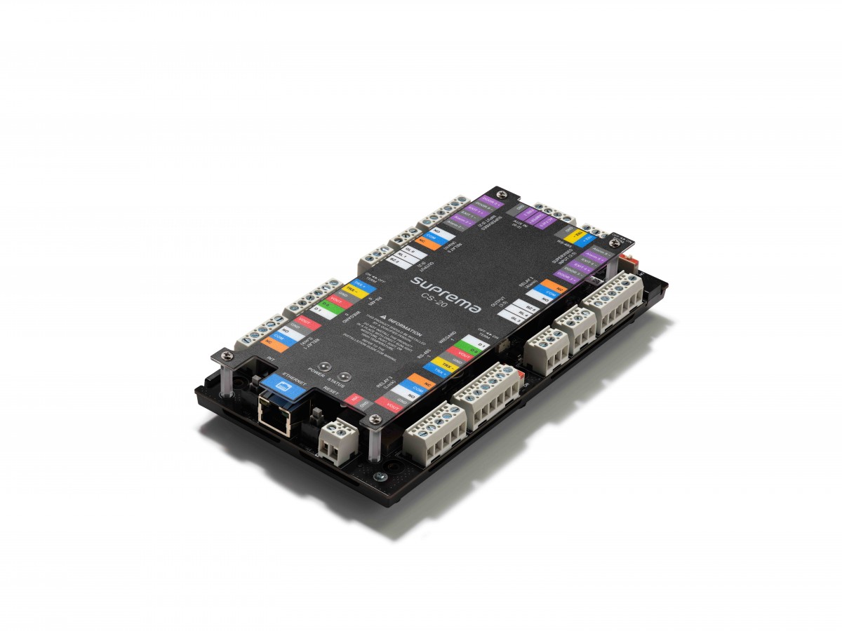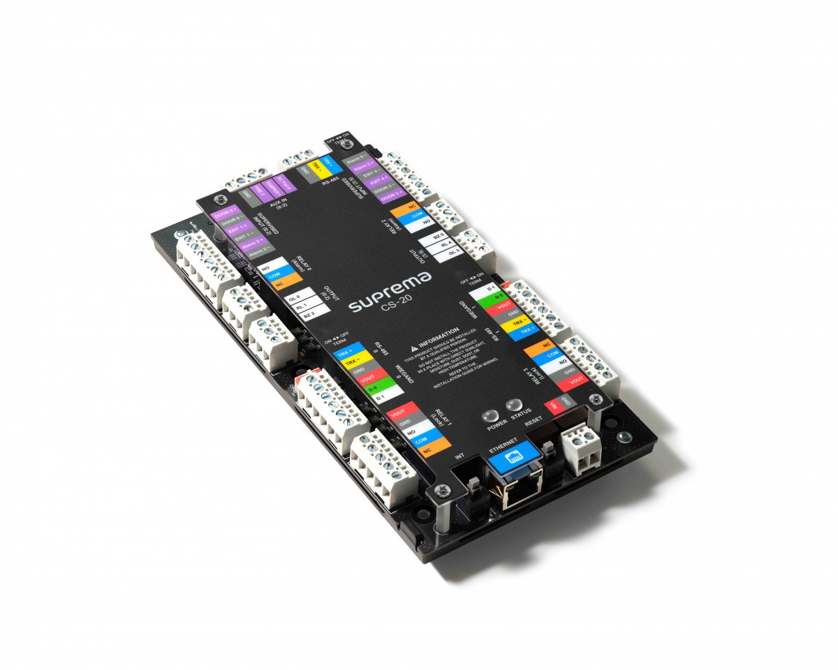 Master IP kontrolér kontroly přístupu Suprema CS-20 (1,2GHz CPU, 4GB flash+256MB RAM). Podporuje protokol OSDP pro připojení zařízení třetích stran. Programuje se pomocí SW BioStar 2, s kterým komunikuje pomocí šifrovaného protokolu TLS1.2. Maximálně 34 dveří s použitím rozšiřujících modulů. Lze propojit více CS-20 do jednoho funkčního celku až do 1 000 dveří.